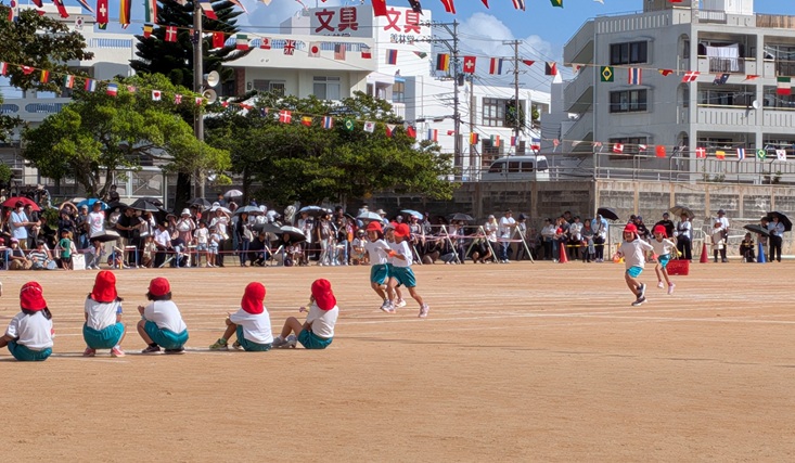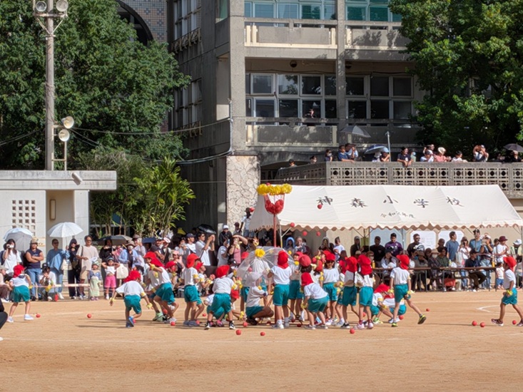 親族の1年生応援のため、神森小学校運動会へ 前日までの4日間水疱瘡感染予防で学年閉鎖だったにも関わらず、元気に かけっこ・玉入れ・ダンス 競技の連続お披露目 ちびっこさんお疲れ様でした。